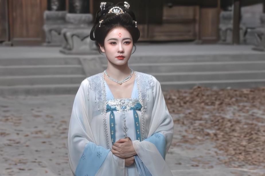 张维娜的面容自带唐风遗韵——鹅蛋脸线条柔和,眉如远山含黛,唇色淡而不寡,穿上织金蹙金绣的公主礼服,恍若敦煌壁画中走出的仕女化身。