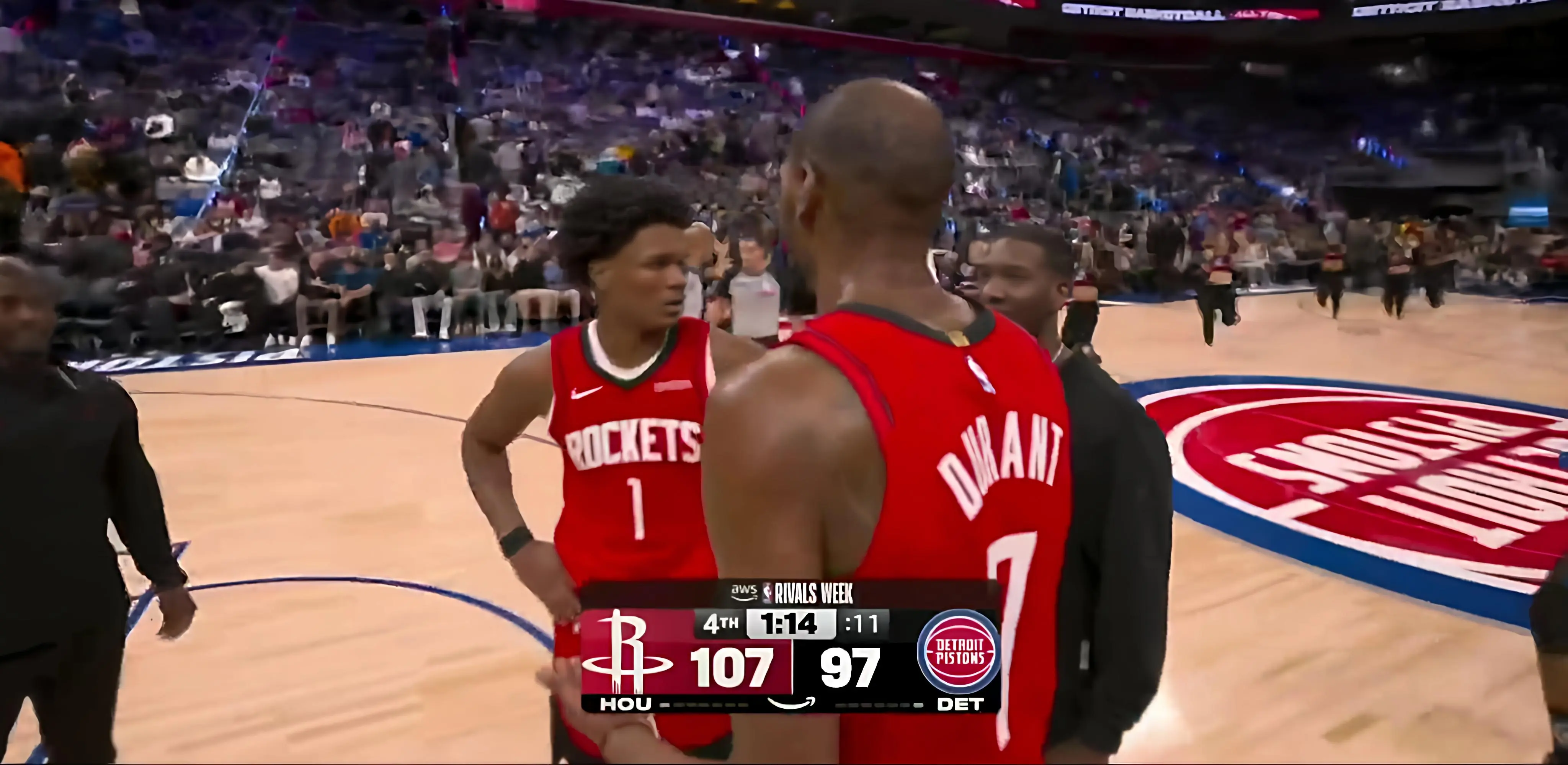 休斯顿火箭队(27胜16负)和底特律活塞队(32胜11负)依然分别稳居西部和东部积分榜的第4位。就在上一场比赛,杜兰特在费城加时赛输球时出现了8次失误,其中在常规时间最后一分钟的失误简直是致命伤。但这次,杜兰特不但弥补了过错,更是超额完成了救赎任务!