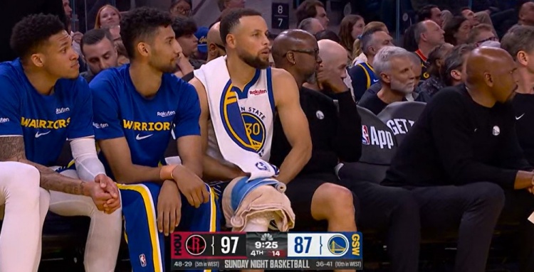 悠着点!库里本场复出 休息时段坐在替补席膝盖裹着厚厚护具